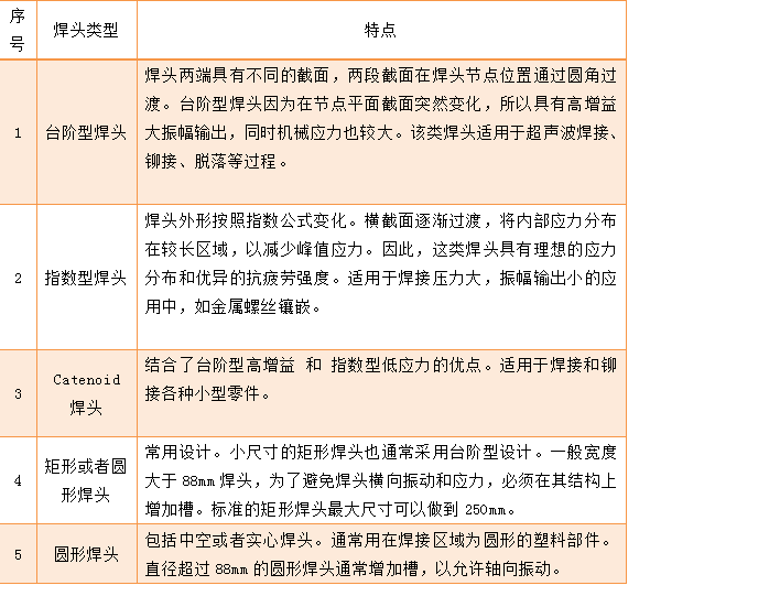 從表中,我們可以清晰的看出,不同類型的焊頭具有不同的特性,適應了不同的焊接需求。南方力勁機械有限公司是一家專業超聲波塑料焊接生產廠家,致力于為用戶提供優質的焊接設備。同時,可為用戶提供專業的焊頭定制服務。公司擁有專業的設計團隊以及加工生產車間,可根據用戶的需求提供專業的解決方案,定制符合焊接要求的焊頭!