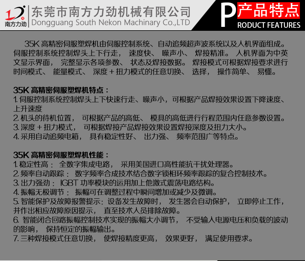 本機由伺服控制系統、自動追頻超聲波系統以及人機界面組成。伺服控制系統控制焊頭上下行走,速度快、噪聲小、焊接精準。人機界面為中英文顯示界面,完整顯示各項參數、狀態及焊接數據。焊接模式可根據焊接要求進行時間模式、能量模式、深度+扭力模式的任意切換、選擇,操作簡單、易懂。